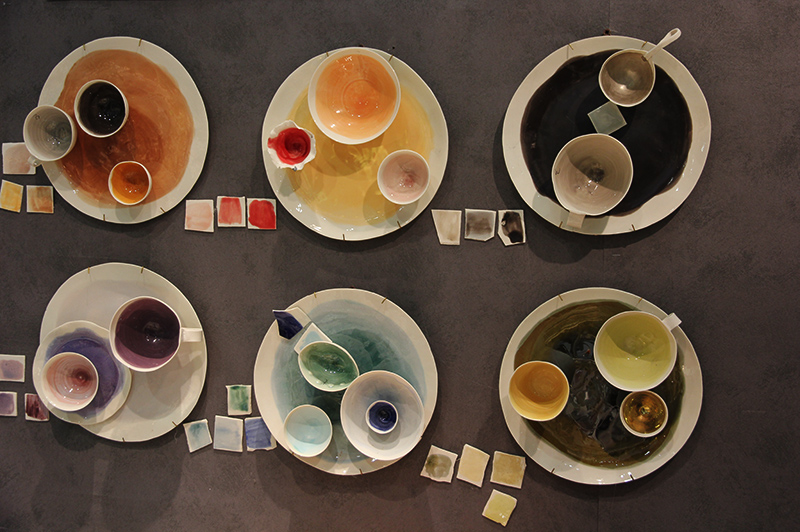 Délicat et fragile, les pièces exposées se déclinent en plusieurs séries. Les sets de table composés de deux assiettes de taille différente, d’un bol et d’une tasse plate, d’un mug et d’une coupe à boire, s’unifie par le glaçage coloré. Pour le thé et le café, les formes originales presque surréalistes s’en donnent « à cœur joie » sur toutes les pièces. De la tasse à l’assiette et aux différents pots, carafes avec des tasses hautes ou basses, les formes sont toutes aussi surprenantes. Les pièces d’exception sont éditées en modèles uniques, comme les gammes Silver et Gold où les applications graphiques d’or et d’argent embellissent la blanche porcelaine lui donnant l’aspect de coquillages nacrés. Une autre série est consacrée aux petits animaux où poissons et oiseaux se posent et s’incrustent délicatement en couleur sur la terre … La série « le Monde » en édition limitée, quant à elle, se joue d’impression mouchetée bleu et verte, ombrant délicatement les sets de table.